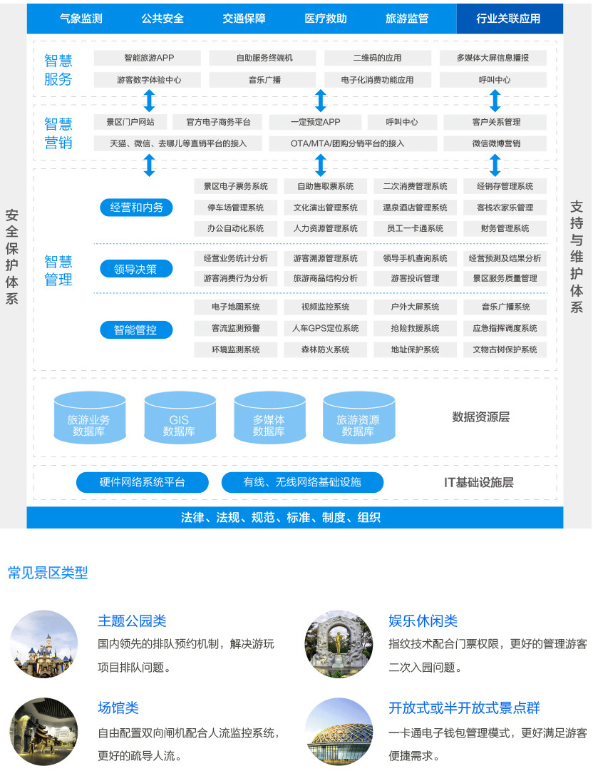聪明景区处理计划,利用进步前辈的物联网感知手艺、RFID中间件手艺、信息集成手艺、挪动付出手艺,完成了“软硬件”手艺跨界整合,开辟了景区聪明化办理的立异之路;完成以旅客休会为焦点的景区办事系统、以宁静保证为焦点的景区办理系统、以电子票务为焦点的景区营销系统,